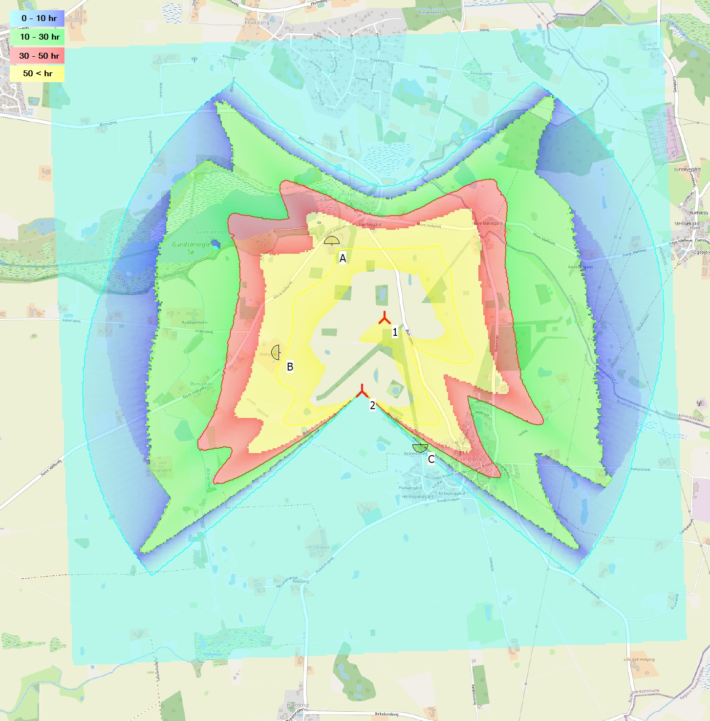 Fig 2: Shadow flickering from fictive wind park in Ørstrup, Denmark calculated using WindPro.